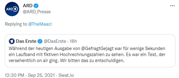 Немецкий телеканал ARD в прямом эфире ошибочно обнародовал строку с "результатами экзитполов". Инцидент произошел за два дня до выборов в бундестаг, которые состоятся 26 сентября. По их итогам сформируется новое правительство и будет выдвинут новый канцлер. Действующий канцлер Германии Ангела Меркель заявила, что уходит из политики после выборов.