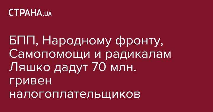 Соответственно, партия "Народный фронт" получит 25 136 400 гривен, "Партия "Блок Петра Порошенко -"Солидарность" - 24 771 800 гривен, "Объединение "Самопомич" - 12 461 650 гривен, "Радикальная Партия Олега Ляшко" - 8 453 925 гривен.