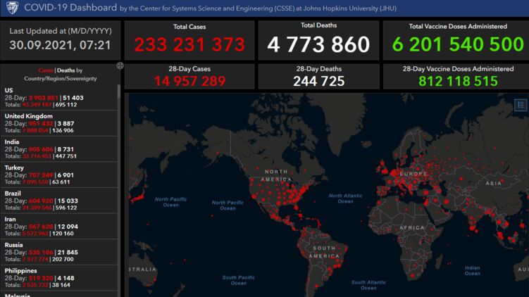 По данным на утро 30 сентября число зараженных на Земле перевалило за 233 миллиона, фото arcgis.com