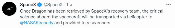 "После того, как команда SpaceX извлечет Cargo Dragon, важные научные данные на борту космического корабля будут доставлены на вертолете в Космический центр NASA имени Кеннеди и предоставлены исследователям", - заявили в пресс-службе SpaceX.