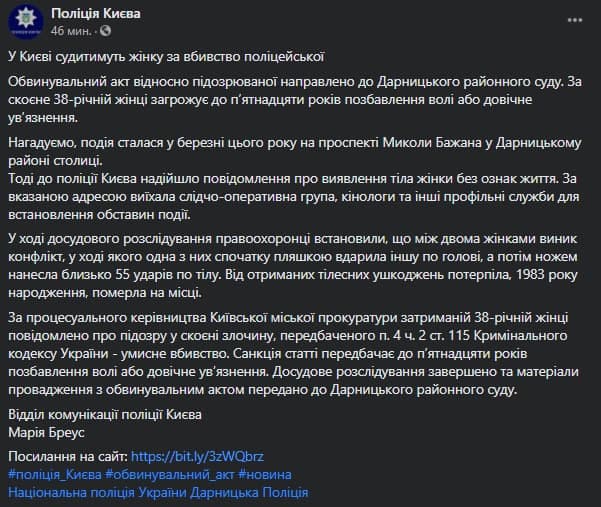 55 ножевых ран. В Киеве будут судить женщину за жестокое убийство сотрудницы полиции