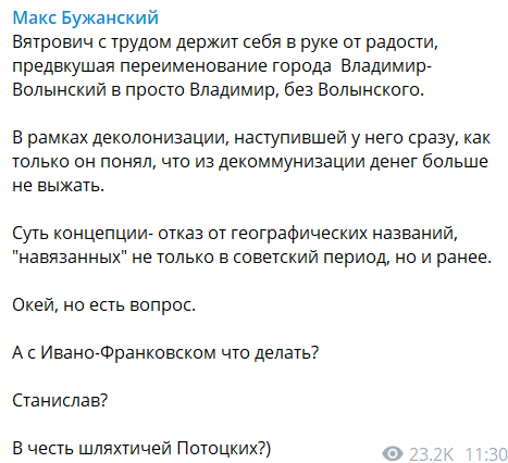 "Вятрович с трудом держит себя в руке от радости, предвкушая переименование города Владимир-Волынский в просто Владимир, без Волынского.