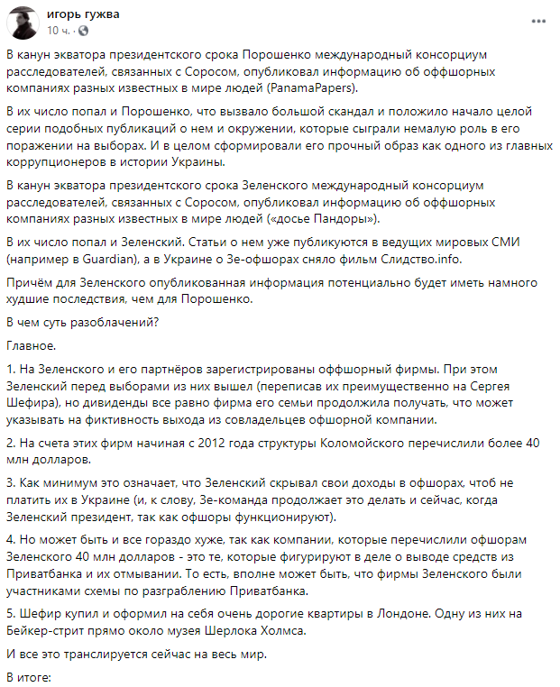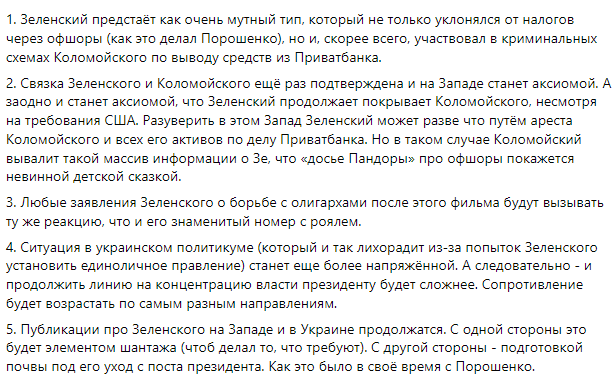 "1. Зеленский предстаёт как очень мутный тип, который не только уклонялся от налогов через офшоры (как это делал Порошенко), но и, скорее всего, участвовал в криминальных схемах Коломойского по выводу средств из Приватбанка.