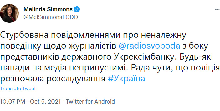 Реакция посла Великобритании на нападение на журналистов. Источник: Twitter/Мелинда Симмонс