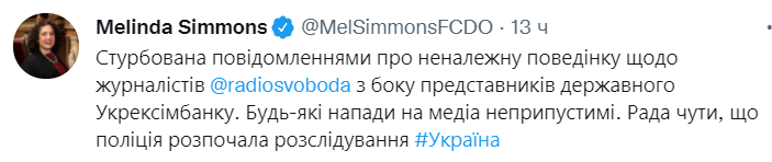 Если до публикации видео руководство банка вело себя вызывающе - говорило, что само подаст заявление на журналистов - то после появления ролика началась реакция иного порядка. Пошла критика из западных посольств. Возмущенный твит написала посол Великобритании Мелинда Симмонс.