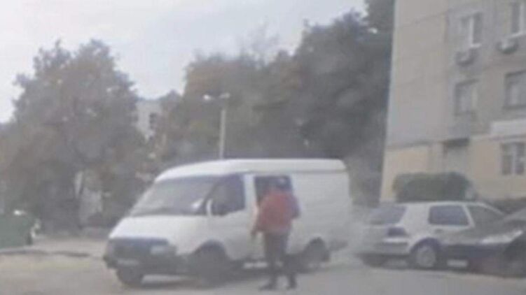 На видео видно, как микроавтобус медленно начинает трогаться, но не может выехать на дорогу, поскольку рядом находятся другие машины.