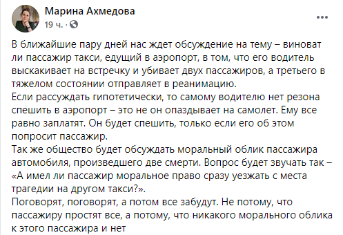 "В ближайшие пару дней нас ждет обсуждение на тему – виноват ли пассажир такси, едущий в аэропорт, в том, что его водитель выскакивает на встречку и убивает двух пассажиров (по факту одного - Ред.), а третьего в тяжелом состоянии отправляет в реанимацию.