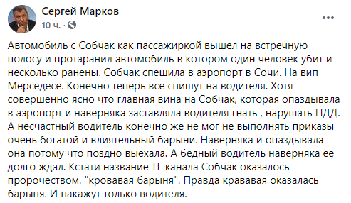 "Автомобиль с Собчак как пассажиркой вышел на встречную полосу и протаранил автомобиль в котором один человек убит и несколько ранены. Собчак спешила в аэропорт в Сочи. На вип Мерседесе. Конечно теперь все спишут на водителя. Хотя совершенно ясно что главная вина на Собчак, которая опаздывала в аэропорт и наверняка заставляла водителя гнать, нарушать ПДД. А несчастный водитель конечно же не мог не выполнять приказы очень богатой и влиятельный барыни. Наверняка и опаздывала она потому что поздно выехала. А бедный водитель наверняка её долго ждал. Кстати название ТГ канала Собчак оказалось пророчеством. "кровавая барыня". Правда кровавая оказалась барыня. И накажут только водителя", - написал в Facebook политолог Сергей Марков.