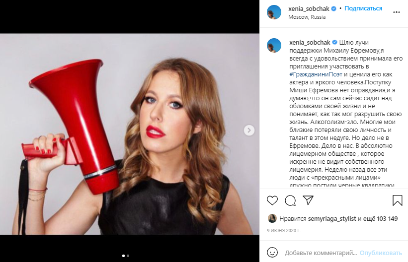 Также Ксения критиковала тех, кто осуждает Ефремова, подозревая, что они якобы мстят за его гражданскую позицию (актер поддерживал оппозицию Путину).
