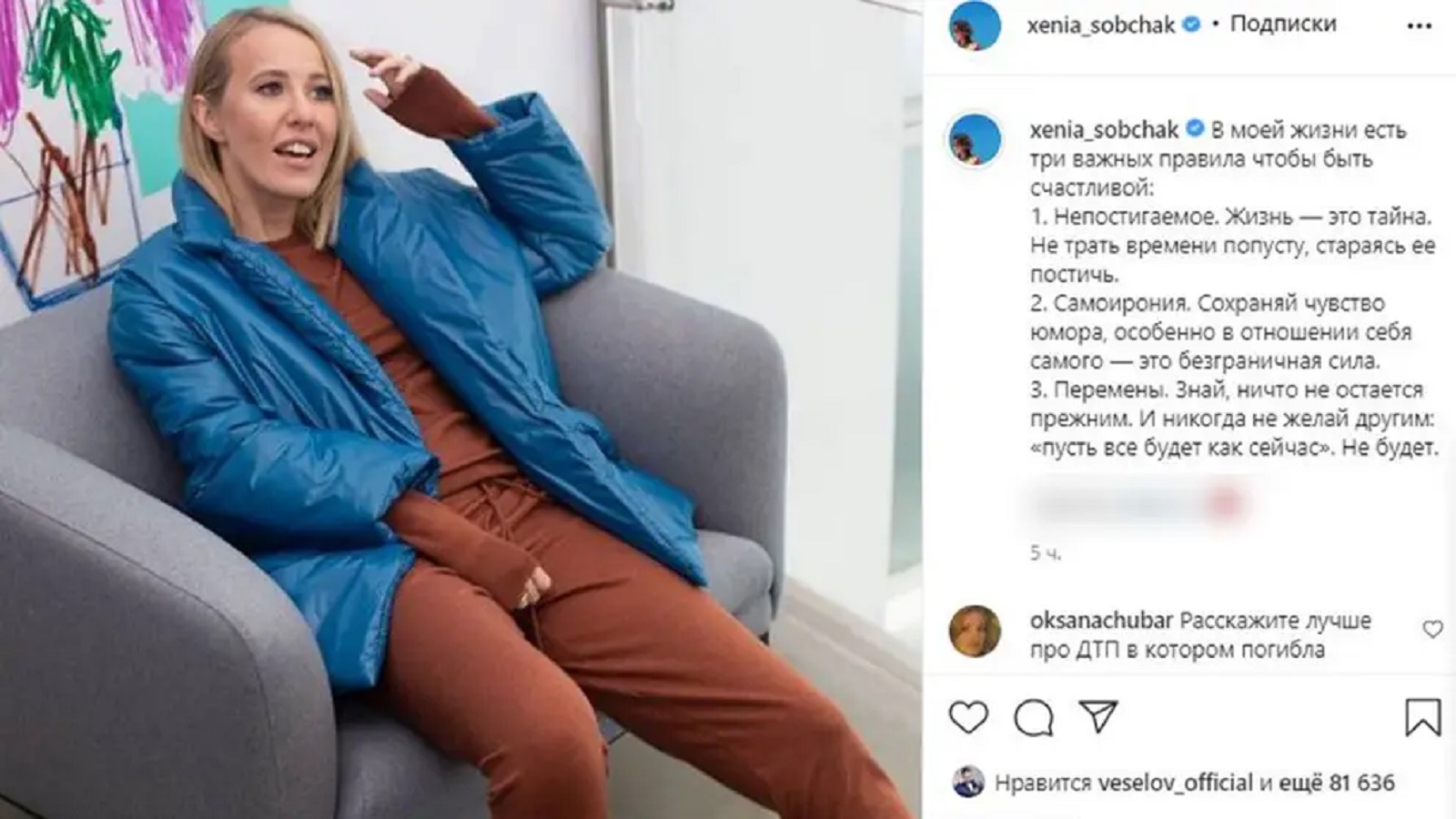 3. Почему сразу после аварии на странице Собчак в Instagram вышел пост о счастье?