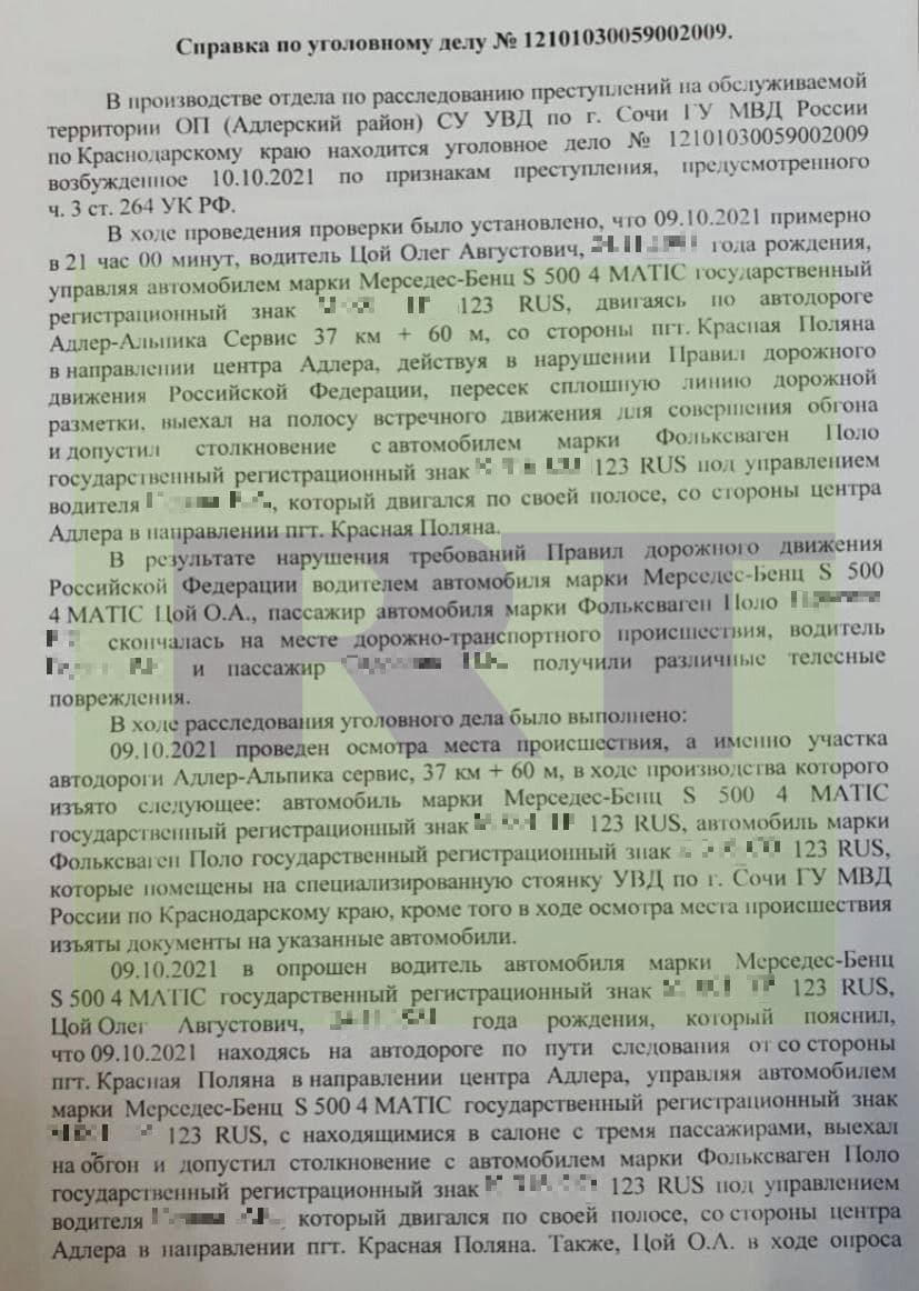 Владелец мерседеса, за рулём которого работал Олег Цой, рассказал полицейским, что водитель ездил без штрафов и характеризовал его как спокойного, уравновешенного и интеллигентного человека. Мол, поэтому ему и доверяли работу с ВИП-клиентами. Почему Цой решил гнать по встречке, его работодатель не понимает.