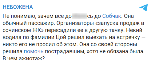 "Она обычный пассажир. Организаторы "запуска продаж в сочинском ЖК" пересадили ее в другую тачку. Некий водила по фамилии Цой решил выехать на встречку - никто его не просил об этом. Она со своей стороны решила помочь пострадавшим, хотя не обязана была. В чем ажиотаж?"