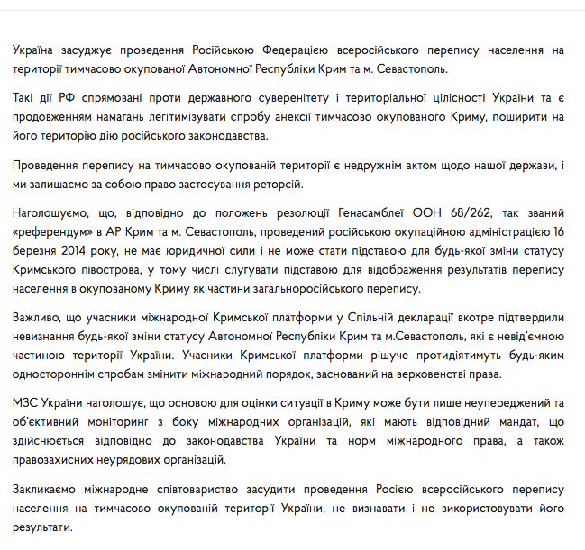 С утра заявление опубликовал МИД Украины. Ведомство осудило начало российской переписи населения на территории Крыма. Ее Киев назвал недружественным актом по отношению к Украине, оставляющим за ней право применения реторсий (принудительных действий). "Такие действия РФ направлены против государственного суверенитета и территориальной целостности Украины", — заявили в МИД.
