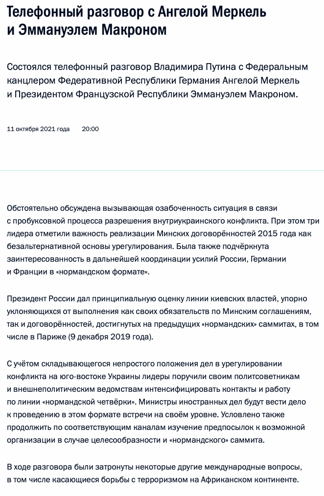 Отчет на сайте Путина о его общении с Меркель и Макроном появился в 20:00.