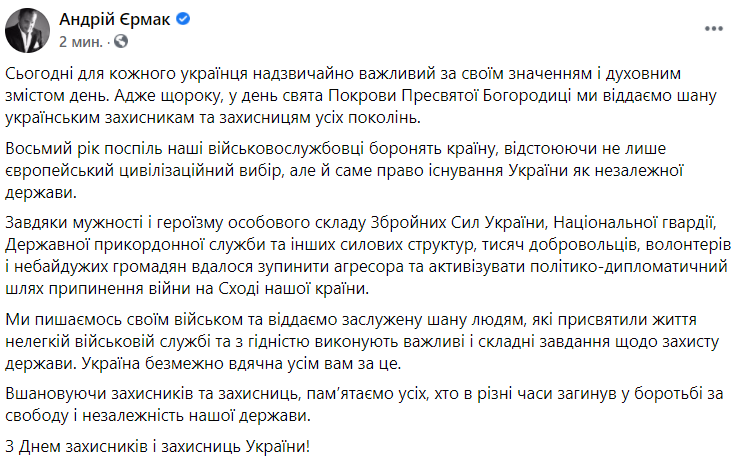 10:48  С праздником поздравил глава Офиса президента Андрей Ермак. Он заявил, что ВСУ на Донбассе отстаивали "европейский цивилизационный выбор".