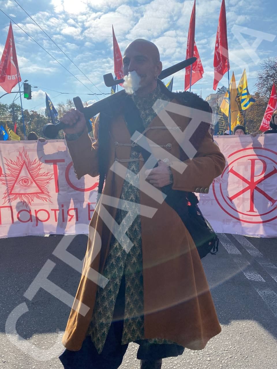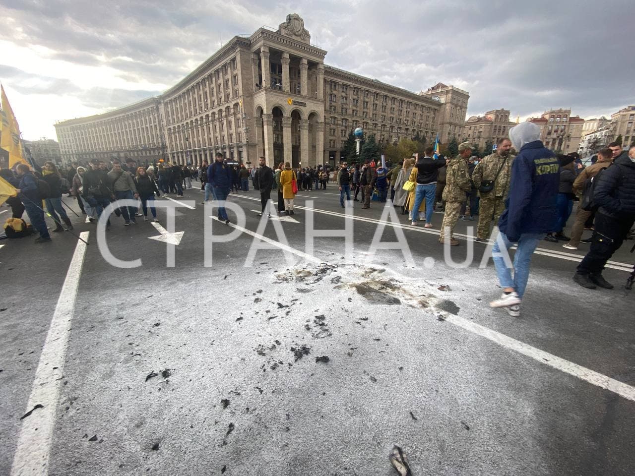 14:32 Колонна приближается к Крещатику. Участник зажег файер.