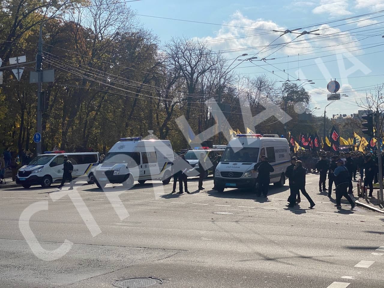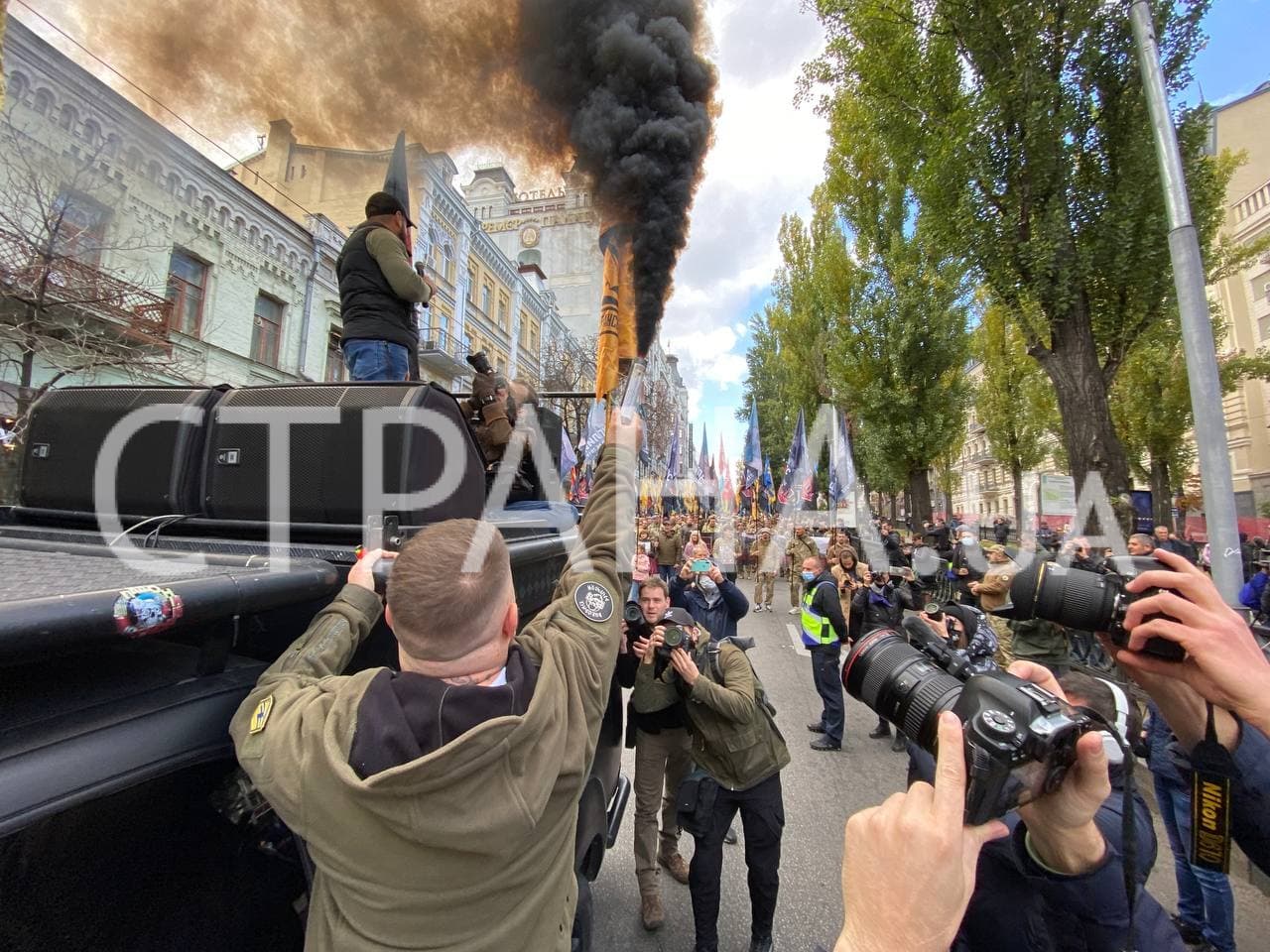 15:00 Участники марша националистов зажгли файеры, весь центр Киева в дыму.