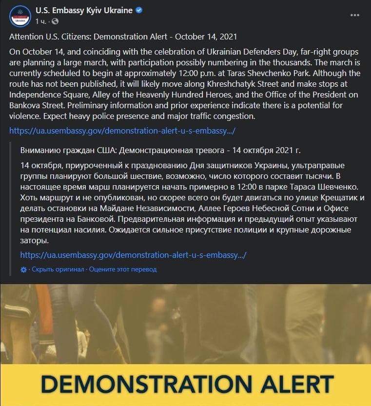 13:06 Посольство США в Киеве опубликовало в Facebook предупреждение о возможном насилии на марше националистов в центре Киева.