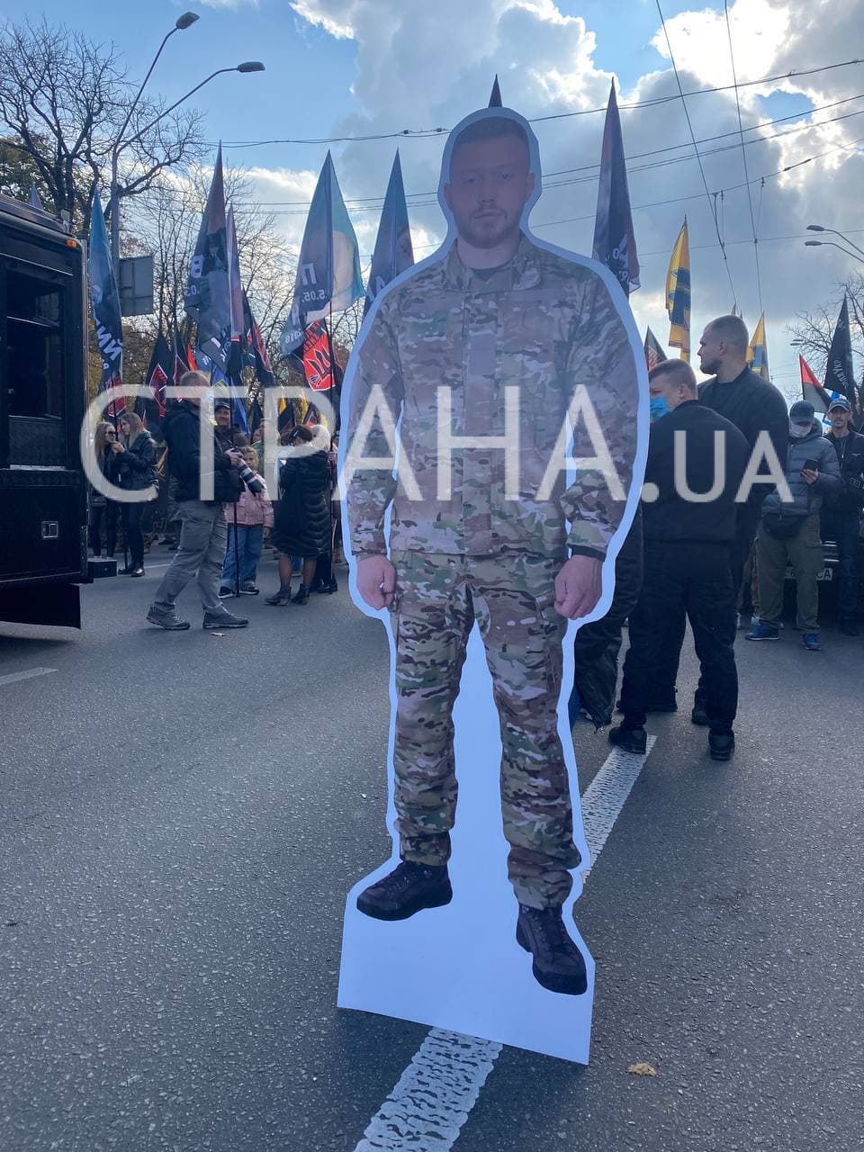 13:48 Митинг по удаленке. Участники марша принесли картонную фигуру одного из членов Нацкорпуса, который не может принять участие в шествии, потому что находится в СИЗО после акции протеста Нацкорпуса под зданием ОП.