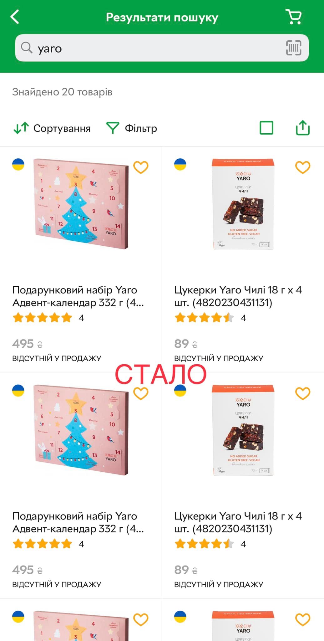 Во вторник, 19 октября, Стерненко написал, что товары Yaro из продажи убрали и другие торговые площадки - Сильпо перестали доставлять в Киеве, исчезла продукция на сайте в Winestore, в "Алло" пишут, что товаров нет в наличии, сеть кофеен "Идеалист" заявила, что прекращает продажу, в Rocket и Glovo также исчезли товары и доставка из заведений Yaro.
