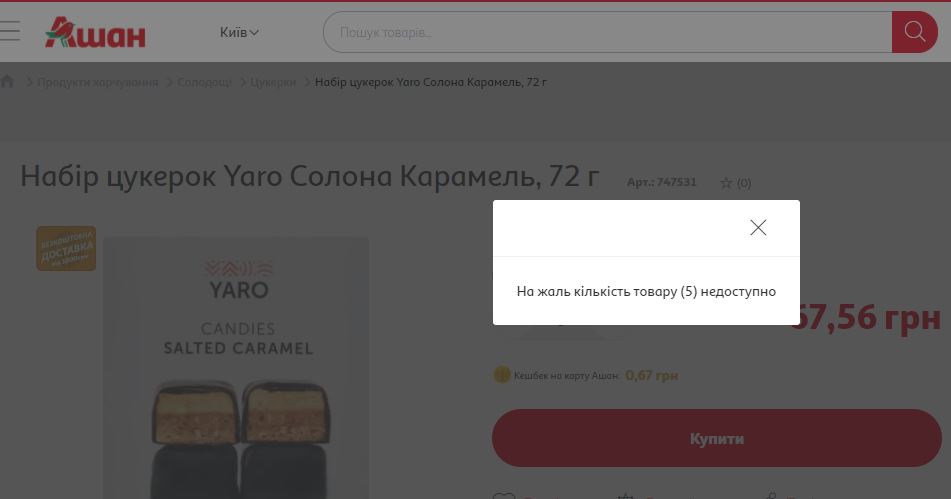 На сайте "Ашана" при выборе товаров ТМ Yaro появляется надпись "недоступно к заказу" либо "нет в наличии".