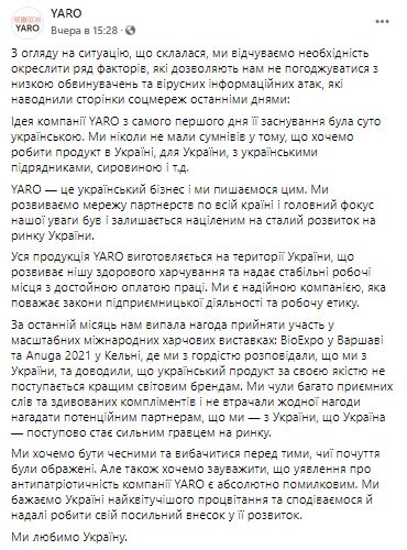 Вся продукция YARO производится на территории Украины, развивающий нишу здорового питания и предоставляет стабильные рабочие места с достойной оплатой труда. Мы - надежная компания, которая уважает законы предпринимательской деятельности и рабочую этику" - говорится в заявлении на странице компании.