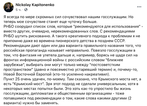Пункт 25 очень удачен, по-моему. Там сказано, что Крымского моста нет, а есть "Крымский мост". Зря этот подход не сделали универсальным, хотя в некоторых местах попытки были. Это хоть как-то упростило бы жизнь госслужащим, дипломатам и общественным организациям - тоже попавшимся под рекомендации о том, какие слова какими другими (2 варианта) нужно бы заменять".