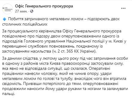 В Офисе Генерального прокурора, добавили, что нападавшим сообщено о подозрении в превышении служебных полномочий, совмещенном с применением насилия (ч. 2 ст. 365 УК Украины).