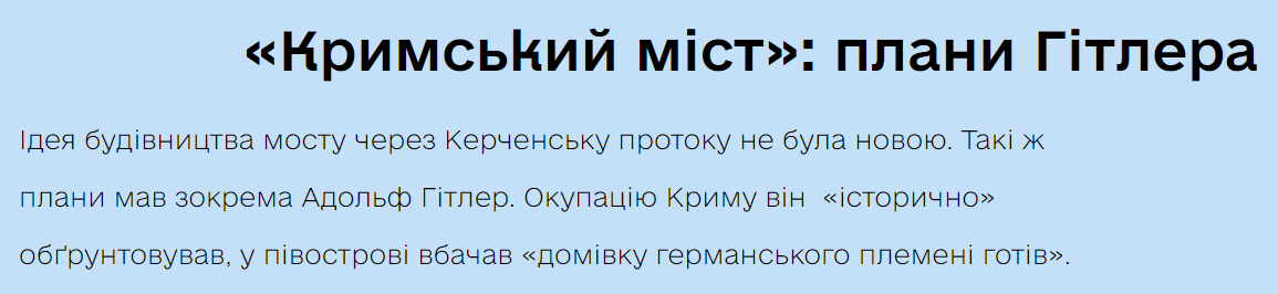 "Идея строительства моста через Керченский пролив ни была новой. Такие же планы имел в частности Адольф Гитлер. Оккупацию Крыма он "исторически" обосновывал, на полуострове видел "дом германского племени готов"", - пишут авторы.