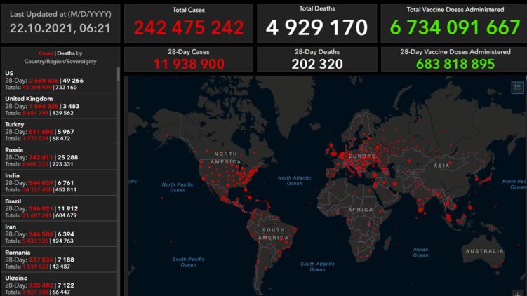 Университет Джона Хопкинса также привел новые данные на утро 22 октября. С начала пандемии на планете уже 242 475 242 человека заразились СOVID-19. Умерли за этот же срок - 4 929 170 человек.