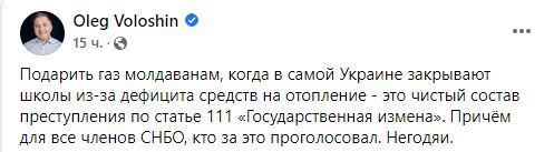 "Подарить газ молдаванам, когда в самой Украине закрывают школы из-за дефицита средств на отопление - это чистый состав преступления по статье 111 "Государственная измена". Причём для все членов СНБО, кто за это проголосовал. Негодяи" - написал депутат от ОПЗЖ Олег Волошин.