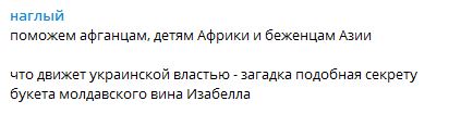 "Поможем афганцам, детям Африки и беженцам Азии. Что движет украинской властью - загадка подобная секрету букета молдавского вина Изабелла" - прокомментировал телеведущий Макс Назаров.
