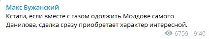 "Кстати, если вместе с газом одолжить Молдове самого Данилова, сделка сразу приобретает характер интересной" - добавил он.