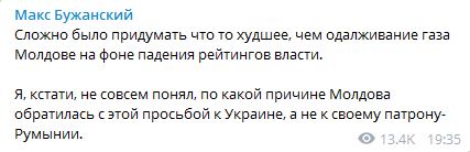 Я, кстати, не совсем понял, по какой причине Молдова обратилась с этой просьбой к Украине, а не к своему патрону- Румынии" - написал нардеп Макс Бужанский.
