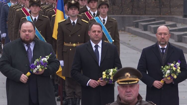 Стефанчук, Ермак и Шмыгаль вместе с президентом возложили цветы в Киеве. Кадр с видео