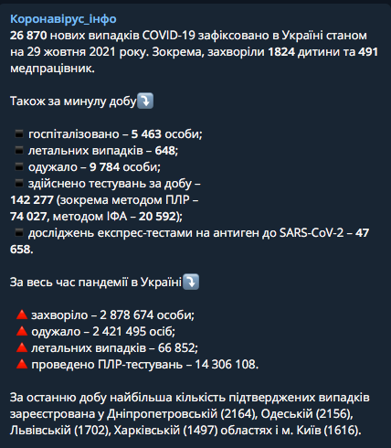 Сегодня, 29 октября, Минздрав Украины сообщил о 26 870 новых случаев заражения коронавирусом. Это новый антирекорд за все время пандемии. Предыдущий был установлен только вчера - эта цифра составила 26 072 человек