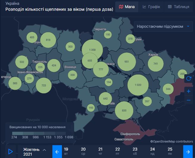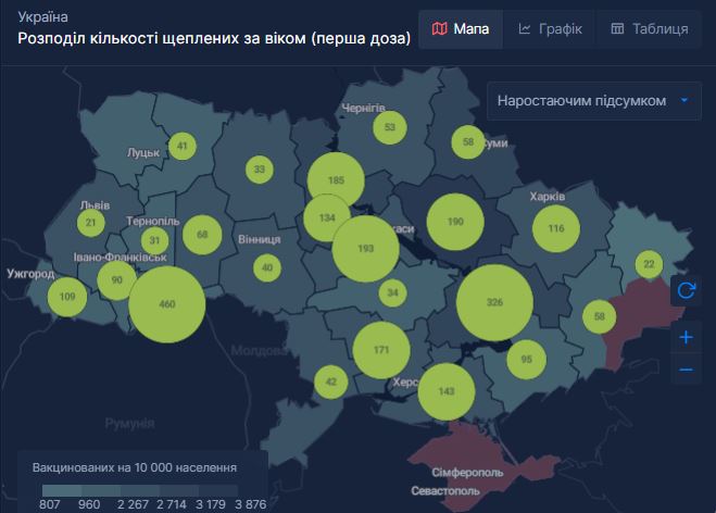 В октябре больше всего привитых 12-15 лет было в Черновицкой области (460), Днепропетровской (326), Черкасской (193), Полтавской (190), в Киеве (185).