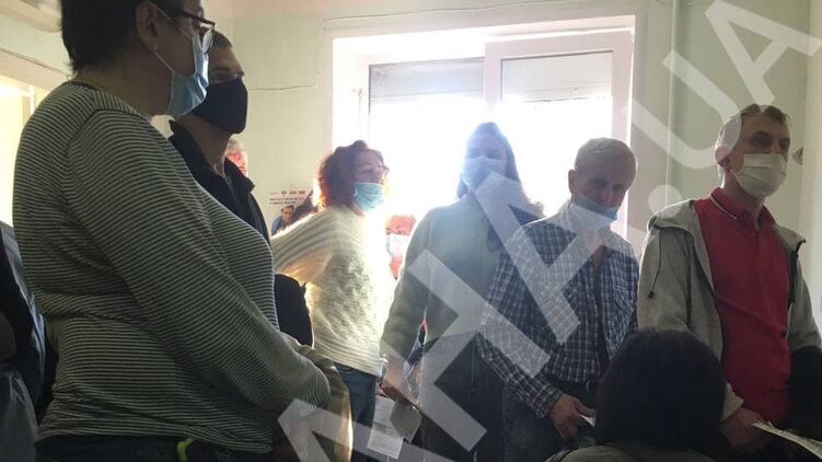 В поликлинике на Вербицкого, 5 в Дарницком районе Киева люди стоят вплотную друг к другу и образовали большие очереди. Кроме того, на одно время записано по три человека, однако вакцинацию проводит только один врач.
