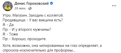 В некоторых магазинах у посетителей также спрашивают о вакцинации, но скорее для проформы. Вот как это описывает блогер Денис Гороховский: