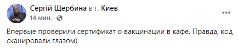Во многих кафе и ресторанах проверяют сертификаты вакцинации, но не сканируют их, а верят на слово. Об этом на своей странице в Facebook написал главный редактор РБК "Украина" Сергей Щербина.