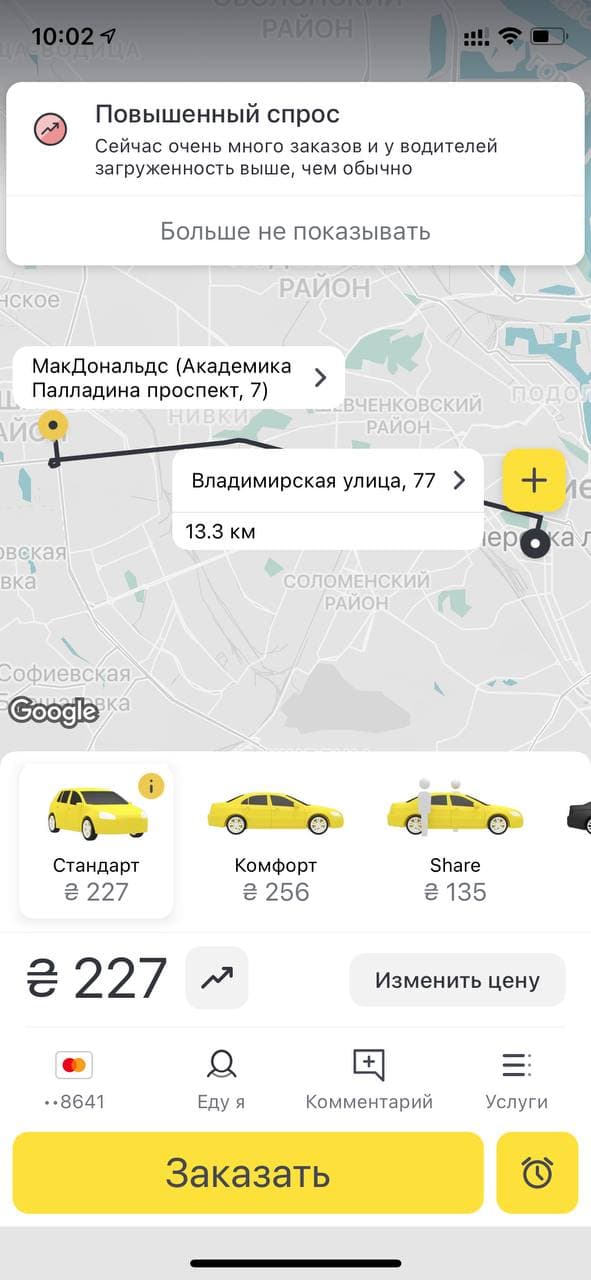 Чтобы добраться с Академгородка на Владимирскую нужно заплатить 227 грн. И приложение сразу предупреждает, что сейчас очень много заказов и у водителей загруженность выше, чем обычно.