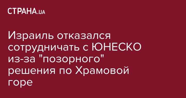 Израиль прекратил сотрудничество с ЮНЕСКО. Об этом сообщает apnews.com. Как стало известно, такой резкий разрыв связан с тем, что ЮНЕСКО приняла резолюцию о святых местах Иерусалима, согласно которой отрицается связь еврейского народа с Храмовой горой.