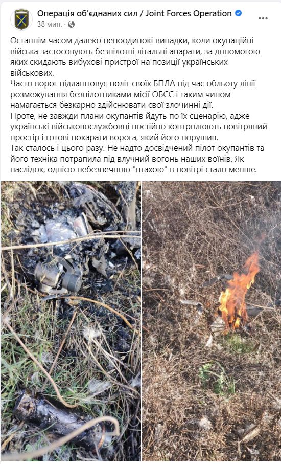 "В последнее время далеко не редки случаи, когда оккупационные войска применяют беспилотные летательные аппараты, с помощью которых сбрасывают взрывные устройства на позиции украинских военных.