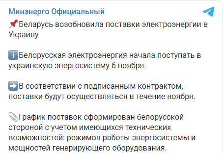 Напомним, с 6 ноября импорт электроэнергии из Беларуси возобновился. Глава энергокомитета Верховной Рады по вопросам энергетики и ЖКУ Андрей Герус сообщил, что импорт 6 ноября в объеме 5 МВт-ч ежечасно осуществляла компания "ТЭТ групп".