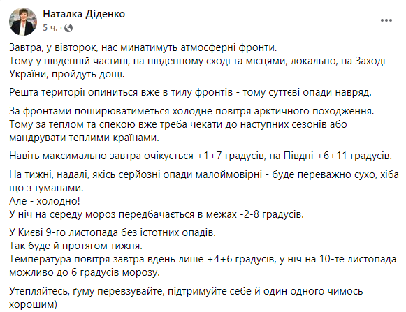 "Температура воздуха завтра днем ​​лишь +4+6 градусов, в ночь на 10 ноября возможно до 6 градусов мороза. Утепляйтесь, резину переобувайте, поддерживайте себя и друг друга чем-то хорошим", - рекомендует Диденко.
