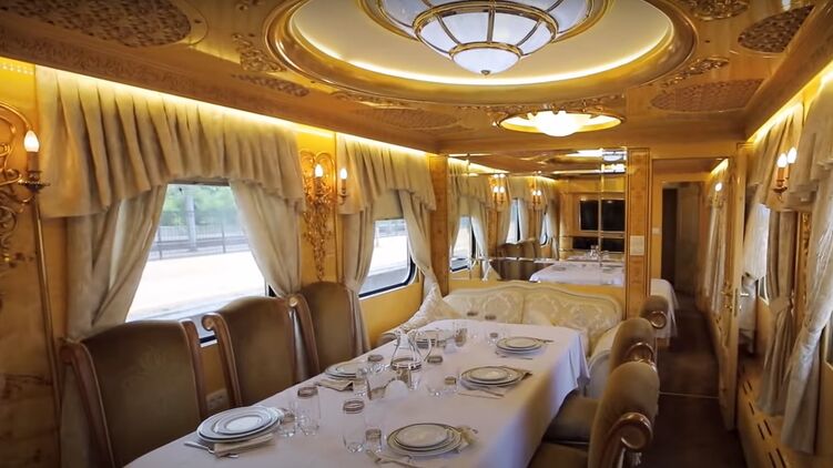 В вагоне "Укрзализныце" премиум-класс изнутри все украшено позолотой, расположен большой обеденный стол, двуспальная кровать и душевая кабина. Билет в такой вагон, чтобы добраться из Киева в Одессу, стоит 24 тысячи гривен и выдается сразу с 1 по 12 место (билет в купе на поезд УЗ "Киев-Одесса" стоит около 600 гривен).
