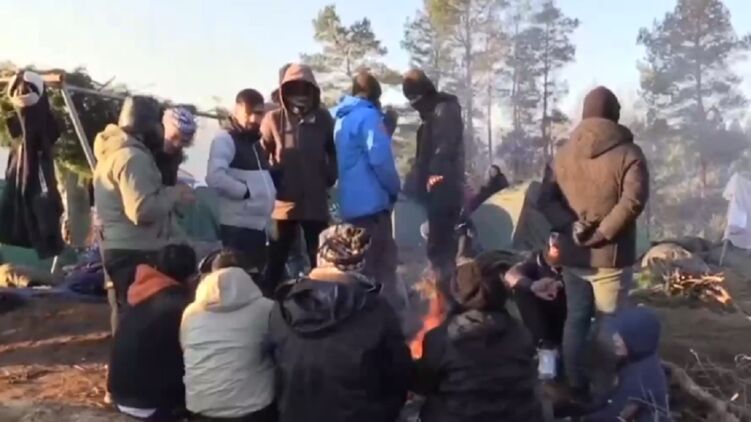 Мигранты обустроили лагерь у границы Беларуси и Польши, которую охраняют тысячи солдат. Видео