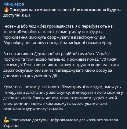 "Иностранцы или люди без гражданства, которые находятся на территории Украины и имеют биометрический вид на жительство, смогут сформировать его в приложении "Дия", - сообщило Минцифры.