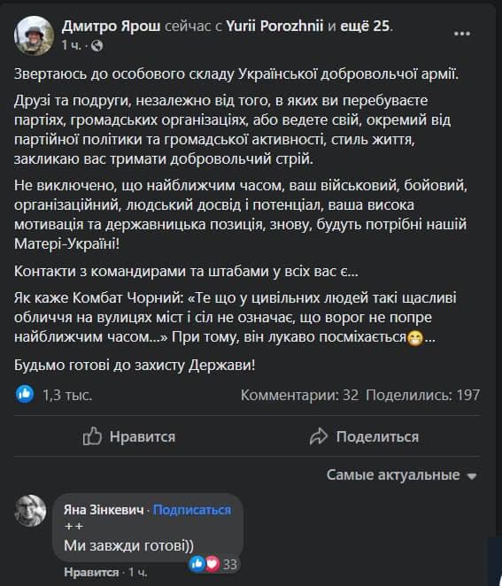 "Друзья и подруги, призываю вас держать добровольческий строй. Не исключено, что в ближайшее время ваш военный, боевой, организационный, человеческий опыт и потенциал, ваша высокая мотивация и государственная позиция, опять, будут нужны нашей Матери-Украине! Контакты с командирами и штабами у всех вас есть…", - написал Ярош.
