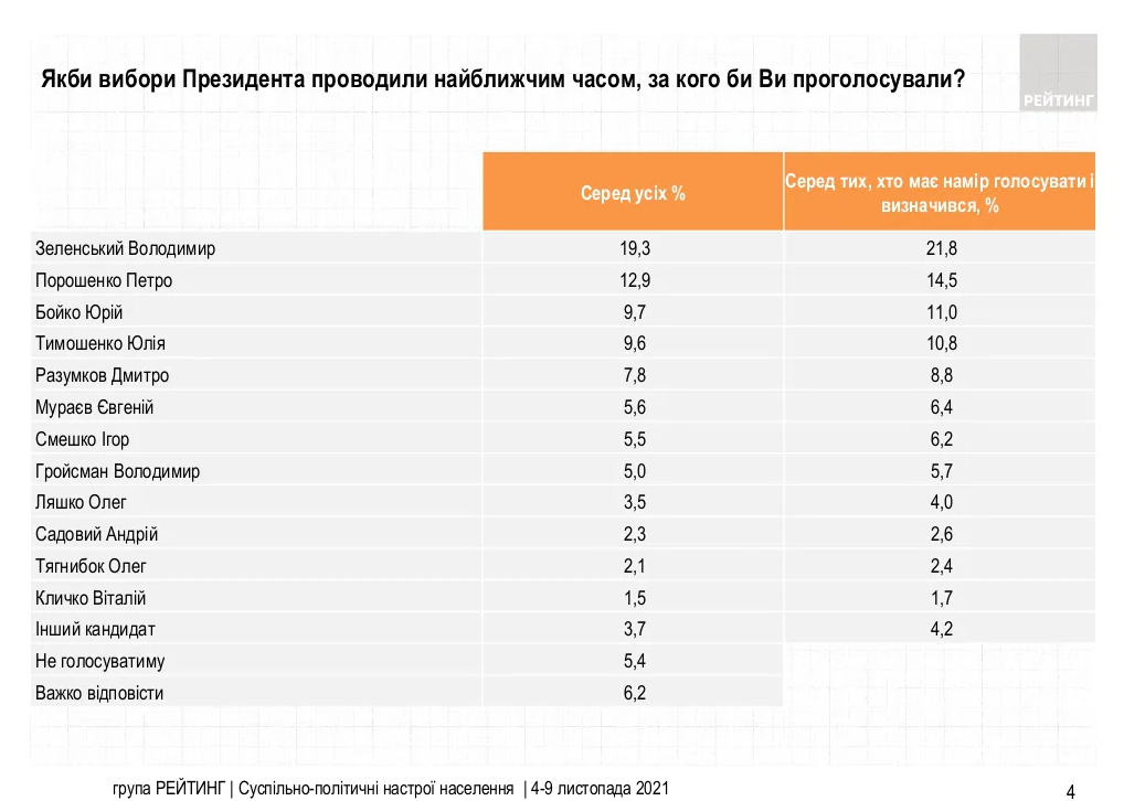 Проведенное в период 4-9 ноября 2021 года исследование показало, что 14,5% поддержали бы Петра Порошенко, 11,0% - Юрия Бойко, 10,8% - Юлию Тимошенко, 8,8% - Дмитрия Разумкова, 6,4% - Евгения Мураева, 6,2% - Игоря Смешко, 5,7% - Владимира Гройсмана, 4,0% - Олега Ляшко, 2,6% - Андоея Садового, 2,4% - Олега Тягнибока, 1,7% - Виталия Кличко.